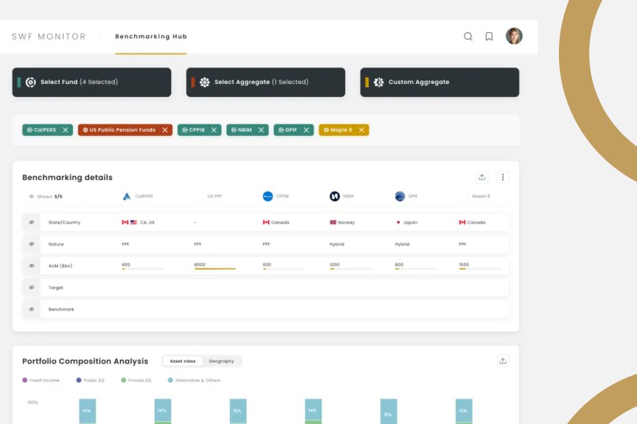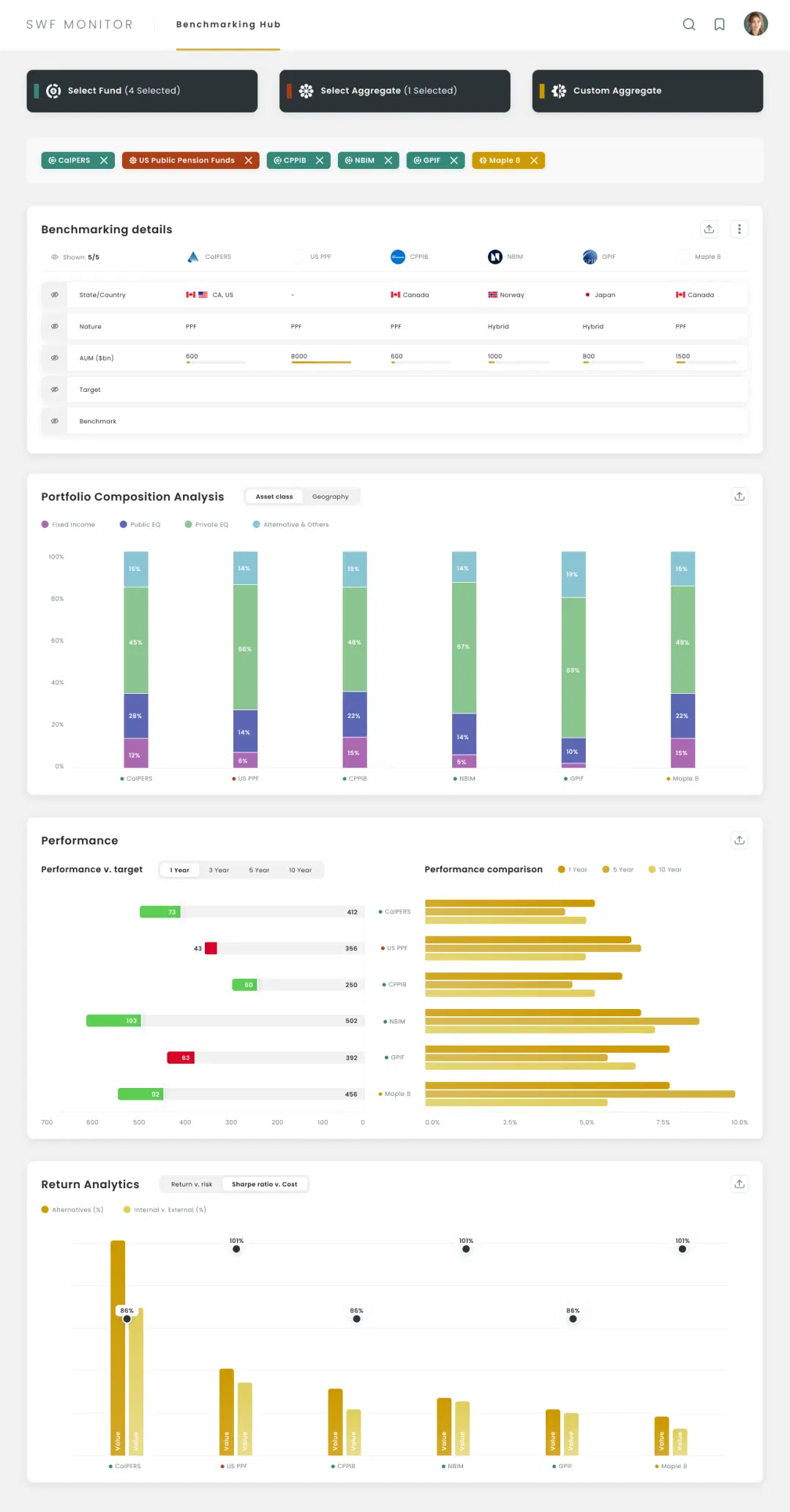 SWF Monitor es una plataforma SaaS de analítica especializada en fondos soberanos y fondos públicos de pensiones. Está dirigida a profesionales del sector financiero, economistas e instituciones que necesitan comparar el desempeño de estos fondos a través de métricas clave de rentabilidad y riesgo.
