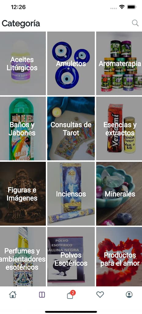 - Navegación intuitiva por categorías de productos como aceites litúrgicos, amuletos, inciensos, minerales, perfumes, polvos y velas esotéricas.